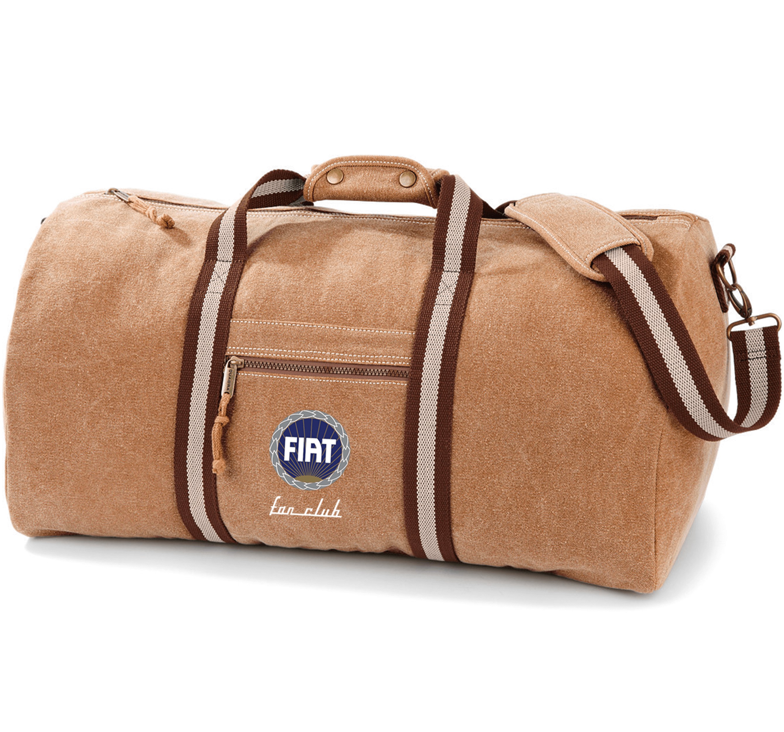 Sac de voyage vintage en toile Fiat en toile lavée. Pochette interne pour objets de valeur. Poche frontale zippée. Fond matelassé.
