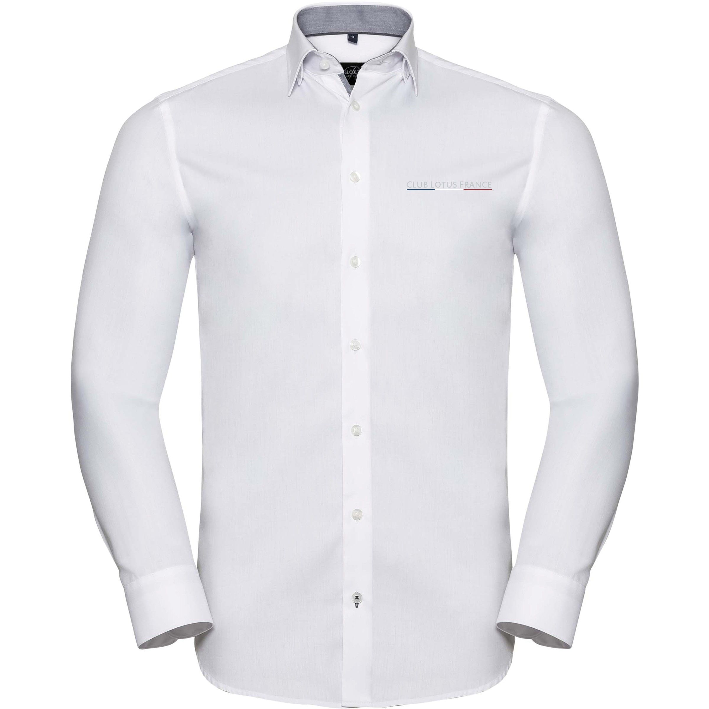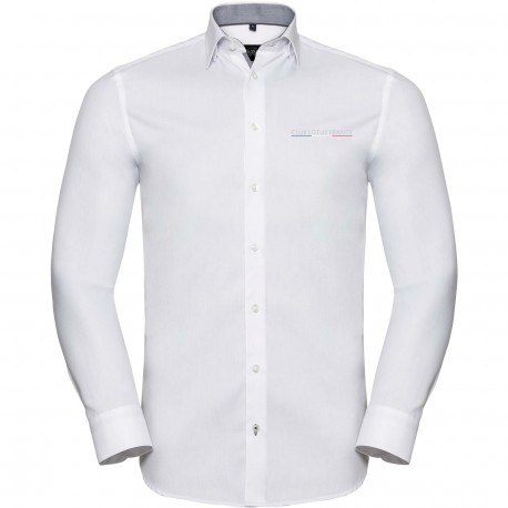 84% coton / 16% polyester. Cintrée. Dessous de col boutonnée. Eléments contrastés : intérieur poignets, intérieur encolure avec passepoil contrasté. Patte de boutonnage basse avec bords contrastés. Couleurs contrastées au niveau de la boutonnière du poignet et de la boutonnière inférieure. Pinces au dos pour un meilleur ajustement.