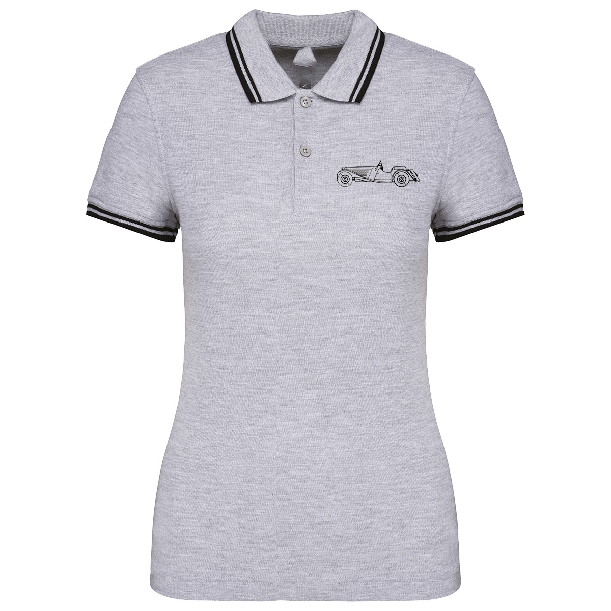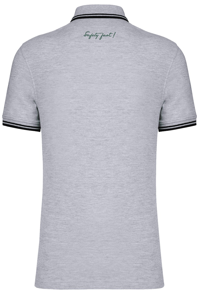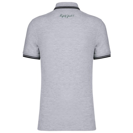 100% coton piqué. Col en bord-côte : liserés dessus et dessous de col contrastés (sauf White : pas de contraste sous le col). Bande de propreté contrastée à l'encolure et aux fentes côtés. Patte de boutonnage col fantaisie 5 boutons. Bord-côte avec liseré contrasté au bas de manches. Finition double aiguille au bas du vêtement. Personnalisé en broderie à l'unité