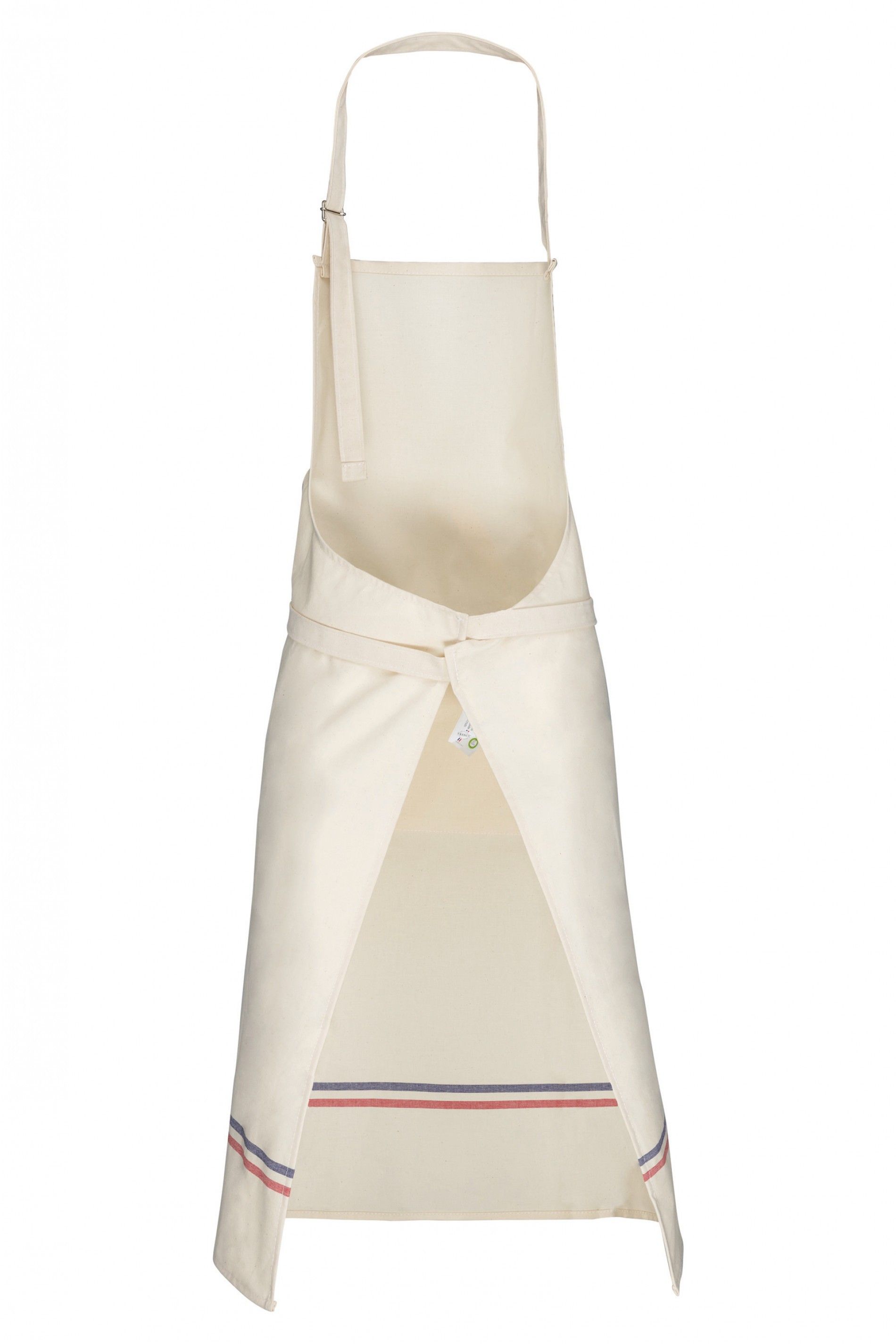 100% coton. Lavage domestique à 60°C. Longueur du tablier ajustable grâce à une boucle de réglage en métal au niveau du cou. Grande poche à l'avant. Motif 2 bandes dans le bas du tablier. Lanière réglage col . Étiquette tissée drapeau France sur la poche avant. Dimensions : H 91 cm x L 78 cm. Poche : H 21 cm x L 31 cm. Label "Origine France garantie. Fabriqué en Bretagne"