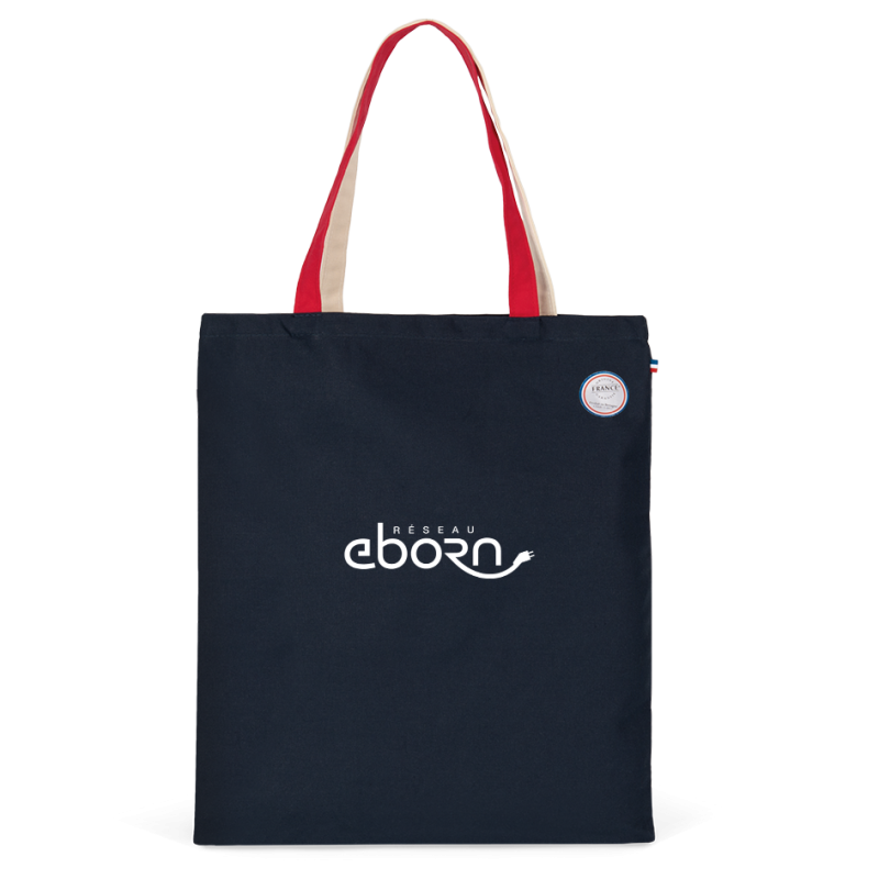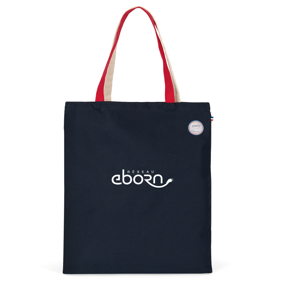 100% coton. Ce sac est conçu à partir de toile de coton. Fabriqué en France, ce produit est labellisé "Origine France Garantie", produit en Bretagne. Une étiquette tissée drapeau français est cousue sur le côté du sac. Anses tissées de 2,5 cm de large et de 50 cm de long sont de couleurs contrastées.